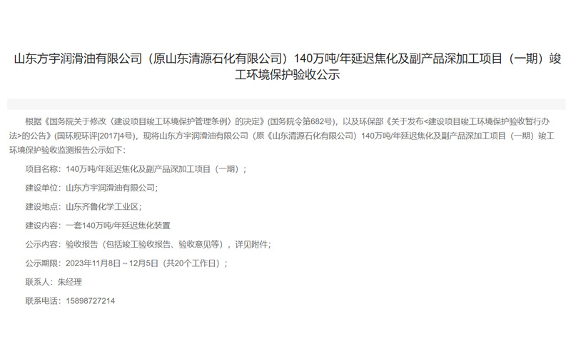 根據(jù)《國務(wù)院關(guān)于修改〈建設(shè)項目竣工環(huán)境保護(hù)管理條例〉的決定》(國務(wù)院令第682號),以及環(huán)保部《關(guān)于發(fā)布<建設(shè)項目竣工環(huán)境保護(hù)驗收暫行辦法>的公告》(國環(huán)規(guī)環(huán)評[2017]4號),現(xiàn)將山東方宇潤滑油